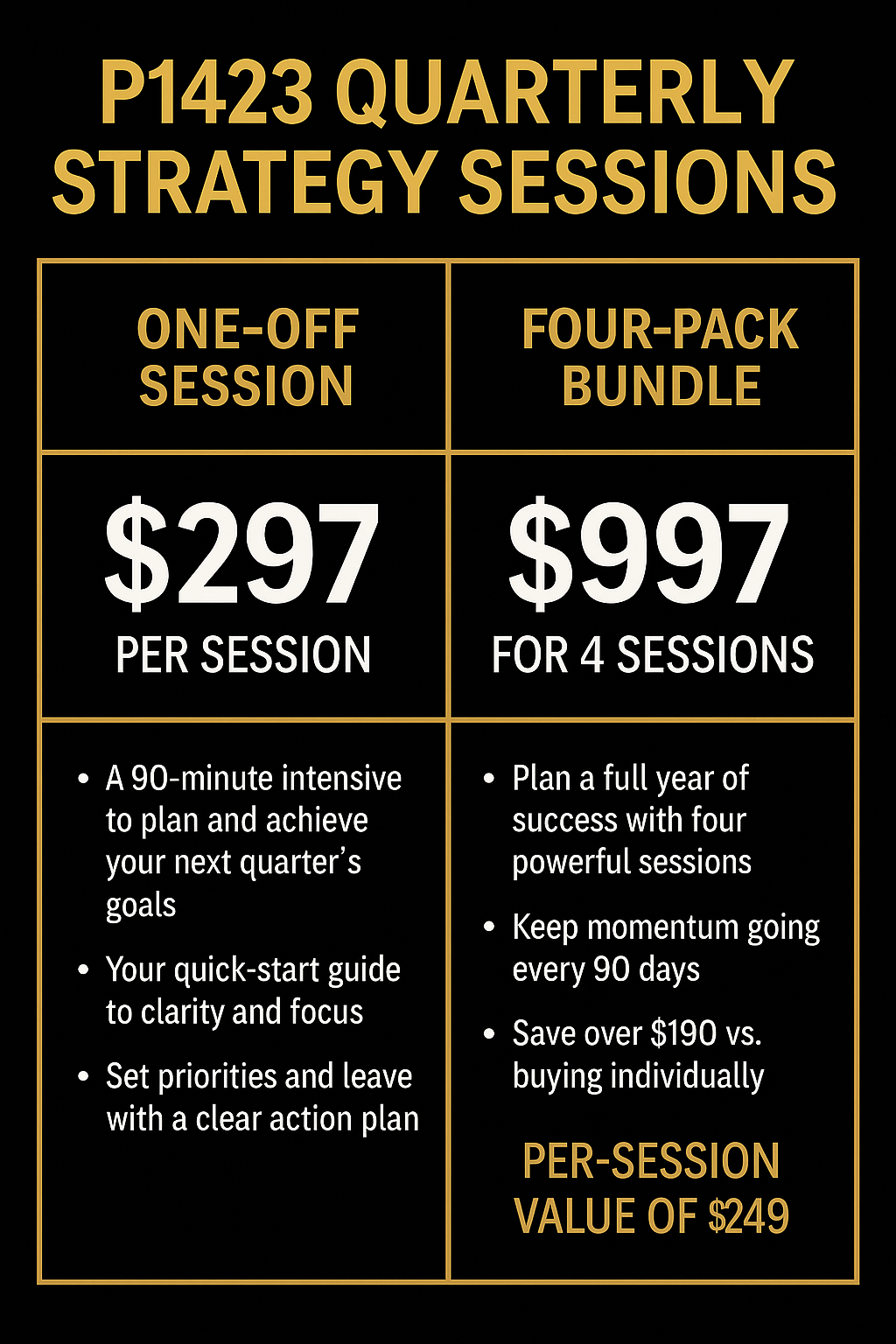 Every 90 days, successful leaders and business owners hit pause to step back, reflect, and refocus. Our Quarterly Strategy Sessions are designed to help you do just that — in just two hours, you’ll gain clarity, confidence, and a concrete plan for the next 90 days.